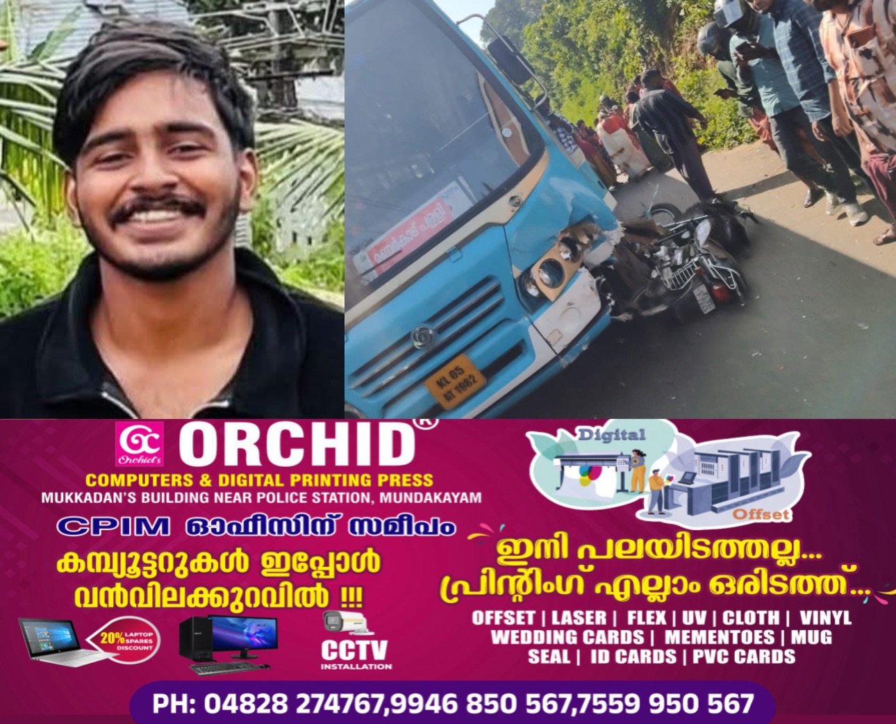 ബസും ബൈക്കും കൂട്ടിയിടിച്ചുണ്ടായ അപകടത്തിൽ യുവാവ് മരിച്ചു.