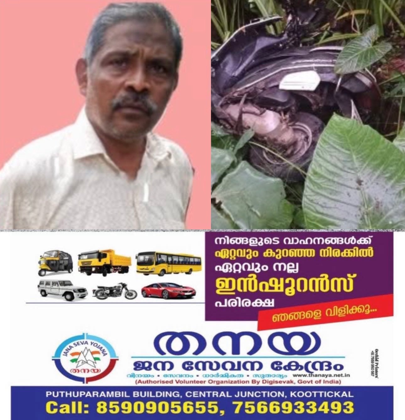 എരുമേലി :എരുമേലി മുണ്ടക്കയം റോഡിൽ തീർത്ഥാടകർ സഞ്ചരിച്ച കാറിടിച്ച് സ്കൂട്ടർ യാത്രക്കാരന് ദാരുണാന്ത്യം അപകടത്തിൽ തുമരംപാറ സ്വദേശി ബാബു ആണ് മരണപ്പെട്ടത് . എരുമേലി പഴയ ഗ്യാസ്ഗോഡൗണിന് സമീപമായിരുന്നു അപകടം.ബൈക്കിനെ ഓവർടേക്ക് ചെയ്തുവന്ന തമിഴ്നാട് സ്വദേശികളായ അയ്യപ്പ തീർത്ഥാടകർ സഞ്ചരിച്ച കാറാണ് അപകടമുണ്ടാക്കിയത് .ബാബു ഇടിയുടെ ആഘാതത്തിൽ സംഭവ സ്ഥലത്ത് തന്നെ മരണപ്പെട്ടതായാണ് അറിയുന്നത് .മൃതദേഹം കാഞ്ഞിരപ്പള്ളി താലൂക്ക് ആശുപത്രിയിലേക്ക് മാറ്റിയതായാണ് വിവരം . എരുമേലി പോലീസ് സ്ഥലത്തെത്തി മേൽ നടപടികൾ സ്വീകരിച്ചു