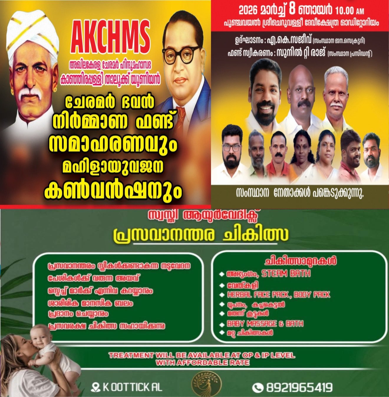 മുണ്ടക്കയം: പുഞ്ചവയലിൽ ചേരമർ ഭവൻ നിർമാണ ഫണ്ട് സമാഹരണവും മഹിളാ-യുവജന കൺവെൻഷനും സംഘടിപ്പിക്കുന്നു. കാഞ്ഞിരപ്പള്ളി യൂണിയൻ ശാഖകളുടെ നേതൃത്വത്തിൽ മാർച്ച് 8 ഞായറാഴ്ച രാവിലെ 10 മണിക്ക് പുഞ്ചവയലിൽ വെച്ചാണ് സമ്മേളനം നടക്കുന്നത്.