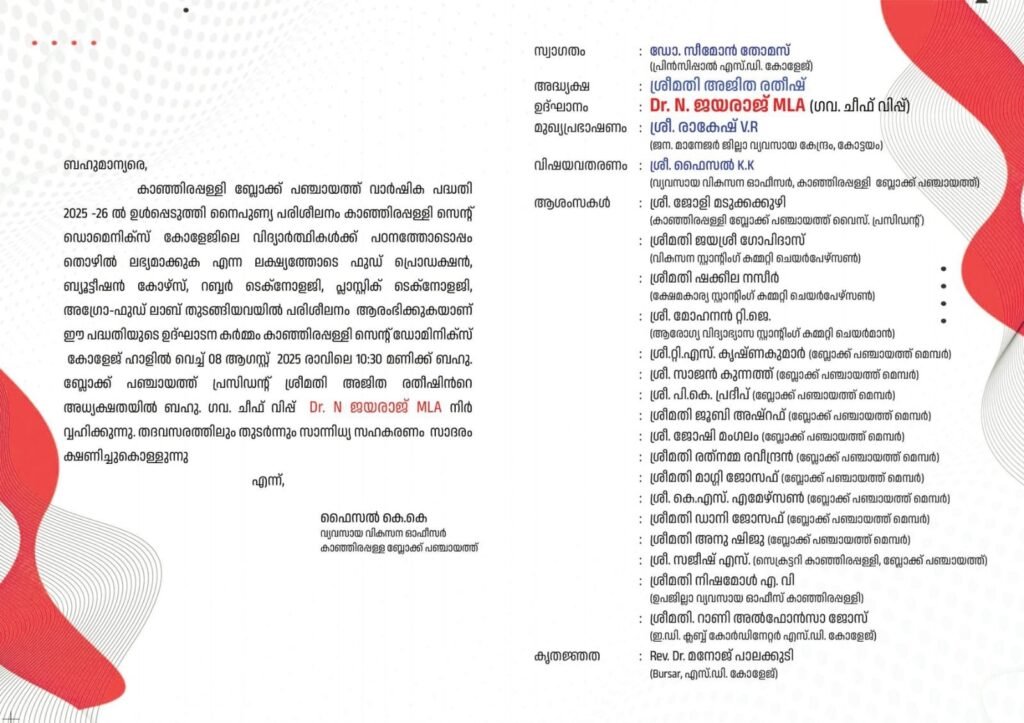 പ്രസ്തുത പദ്ധതിയുടെ ഉല്ഘാടനം ഗവ. ചീഫ് വിപ്പ് ഡോ. എന്. ജയരാജ് എം.എല്.എ. 08.08.2025 രാവിലെ 10.30 ന് സെന്റ് ഡോമിനിക്സ് കോളേജ് ഓഡിറ്റോറിയത്തില് വെച്ച് നടത്തപ്പെടും. ത്രിതലപഞ്ചായത്ത് ഭാരവാഹികള്, കോളേജ് അധികാരികളും പ്രസ്തുത പരിപാടിയില് പങ്കെടുക്കും. കോളേജ് തലത്തില് ഒഴിവു ദിനങ്ങളില് ബ്ലോക്ക് പഞ്ചായത്ത് പദ്ധതിയിലുടെ ഈ കോഴ്സുകള് കുട്ടികള്ക്ക് പഠിക്കാവുന്നതാണ് എന്ന് ബ്ലോക്ക് പഞ്ചായത്ത് പ്രസിഡന്റ് അജിതാ രതീഷ്, വൈസ് പ്രസിഡന്റ് ജോളി മടുക്കകുഴി, സ്റ്റാന്റിംഗ് കമ്മിറ്റി അദ്ധ്യക്ഷന്മാരായ ജയശ്രീ ഗോപിദാസ്, ടി.ജെ. മോഹനന്, ഷക്കീല നസീര്, ബിഡി.ഒ. സജീഷ് എസ്., വ്യവസായ വികസന ഓഫീസര് ഫൈസല് കെ.കെ., റാണി അല്ഫോന്സാ ജോസ്, ഇ.ഡി. ക്ലബ്ബ് കോ-ഓര്ഡിനേറ്റര് എസ്.ഡി. കോളേജ്, തുടങ്ങിയവര് പത്രസമ്മേളനത്തില് അറിയിച്ചു.