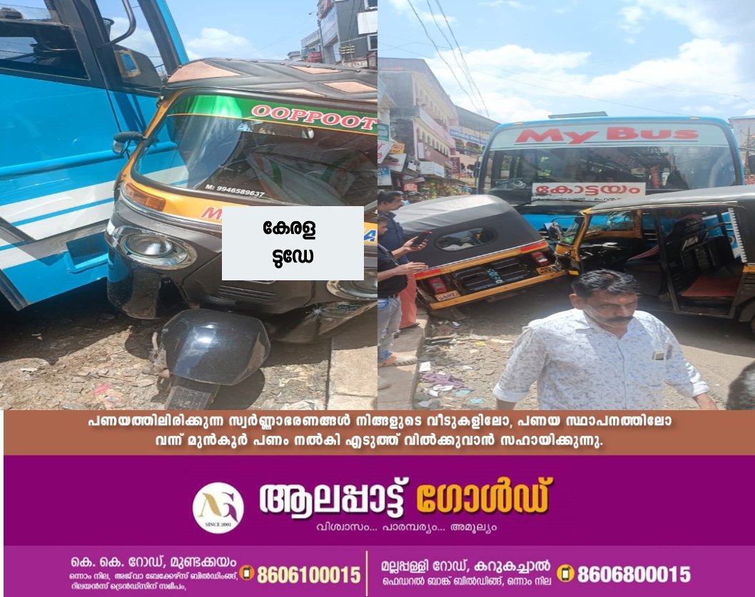 മുണ്ടക്കയം ഭാഗത്തുനിന്നു കോട്ടയത്തേക്കു വരികയായിരുന്ന മൈ ബസ് ആണ് അപകടത്തില്പ്പെട്ടത്. സ്റ്റാന്ഡില്നിന്നു പുറത്തേക്ക് ഇറങ്ങിയ ബസ് അതിവേഗം നിയന്ത്രണം നഷ്ടമായി ഓട്ടോറിക്ഷാ സ്റ്റാന്ഡിലേക്ക് ഇടിച്ചു കയറുകയായിരുന്നു.