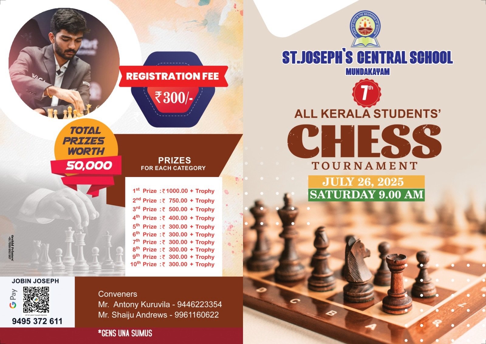 ഏഴാമത് ഓൾ കേരള ഇന്റർ സ്കൂൾ ചെസ്സ് ടൂർണമെന്റ് മുണ്ടക്കയം സെന്റ് ജോസഫ്സ് സെൻട്രൽ സ്കൂളിൽ വച്ച് ഇരുപത്തിയാറാം തീയതി ശനിയാഴ്ച നടക്കും. CBSE, ICSE, STATE സിലബസിലുള്ള സ്കൂൾ കുട്ടികൾ മറ്റുരക്കുന്ന മത്സരങ്ങൾ രാവിലെ 9.00 am ന് ആരംഭിക്കും. പിടിഎ പ്രസിഡണ്ട് ജിജി നിക്കോളാസ് ചെസ് ടൂർണമെന്റ് ഉദ്ഘാടനം ചെയ്യുകയും സ്കൂൾ കൗൺസിലർ ഫാ. മാത്യു കെ ജെ OFM പിടിഎ വൈസ് പ്രസിഡന്റ്മാരായ സ്വപ്ന റോയ്, ജെം തോമസ് എന്നിവരുടെ സാന്നിധ്യത്തിൽ സമ്മാനദാനം നിർവഹിക്കുകയും ചെയ്യും. മാനേജർ ഫാ. മത്തായി മണ്ണൂർവടക്കേതിൽ, പ്രിൻസിപ്പാൾ ഫാ. തോമസ് നാലന്നടിയിൽ, വൈസ് പ്രിൻസിപ്പാൾ ശ്രീ ആന്റണി കുരുവിള, ചെസ്സ് മാസ്റ്റർ ഷൈജു ആൻഡ്രൂസ് എന്നിവർ നേതൃത്വം നൽകും.