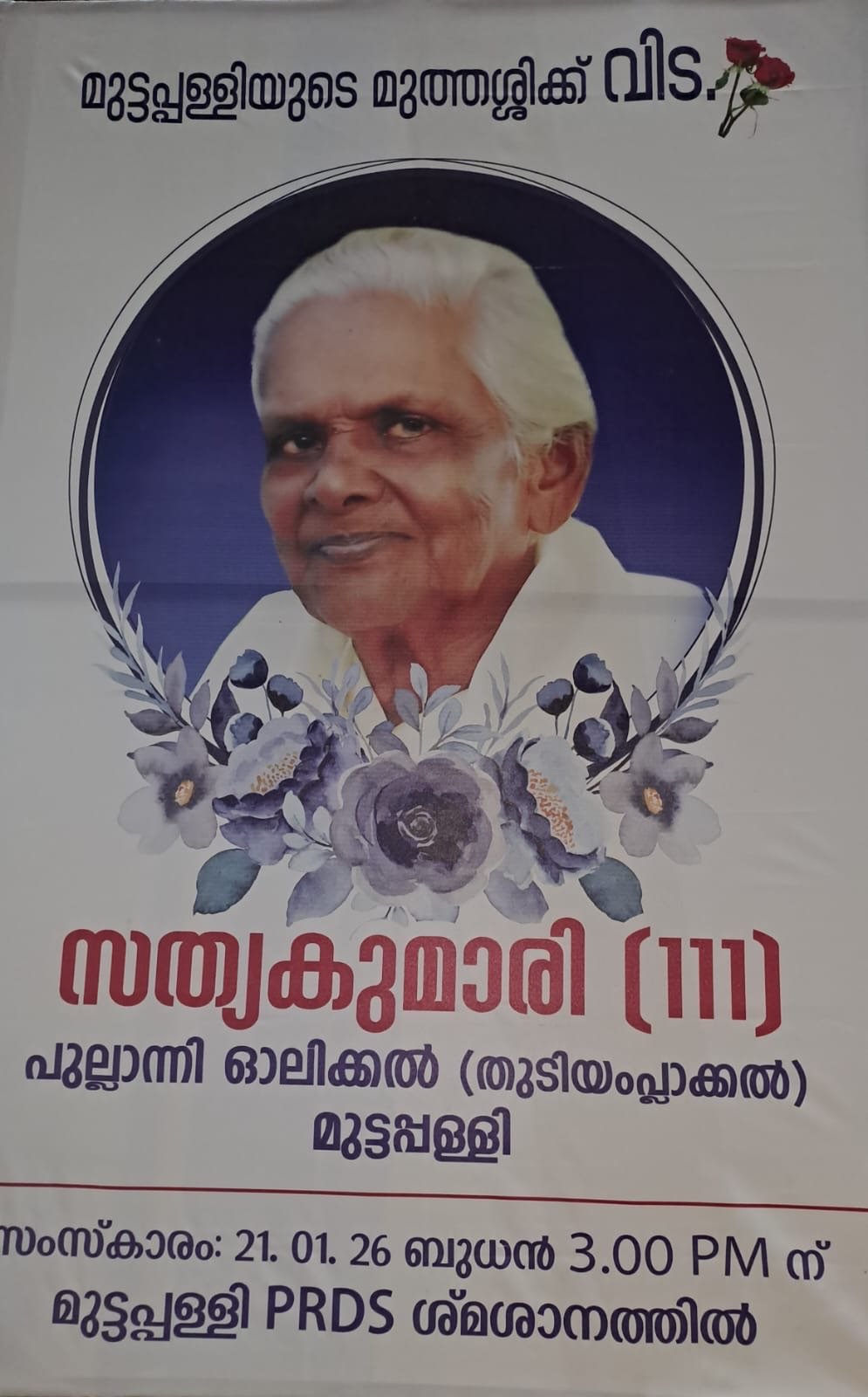 പരേതയോടുള്ള ആദരസൂചകമായി മുട്ടപ്പള്ളിയിൽ പൊതുദർശനം ഉണ്ടായിരിക്കും. സംസ്കാരം ജനുവരി 21 ബുധനാഴ്ച ഉച്ചകഴിഞ്ഞ് 3.00-ന് മുട്ടപ്പള്ളി PRDS ശ്മശാനത്തിൽ നടക്കും.
