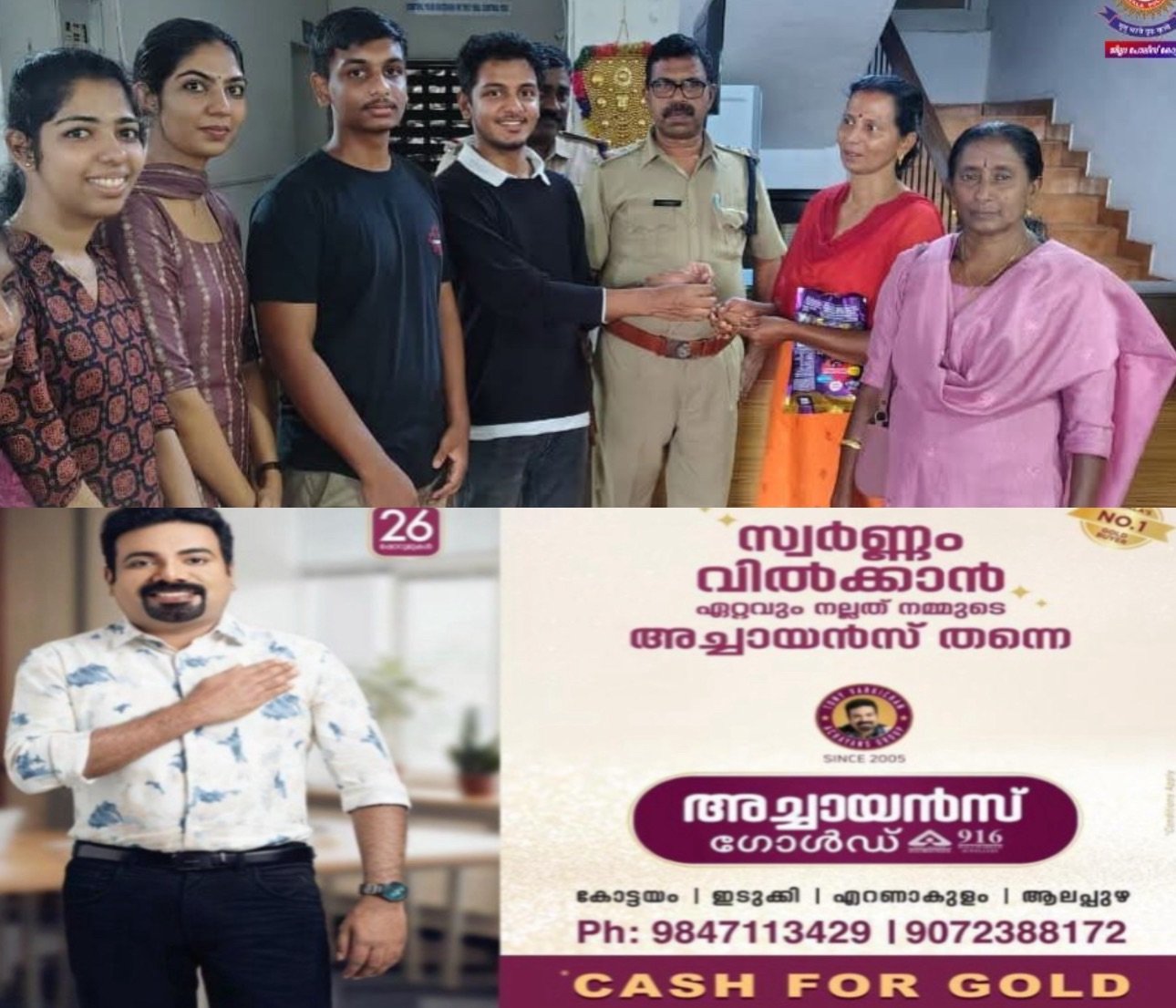 മാല കളഞ്ഞു കിട്ടിയ കുറുമ്പൻമൂഴി ഉൾപ്പെടുന്ന വെച്ചൂച്ചിറ പോലീസ് സ്റ്റേഷൻ ഉൾപ്പെടെ ഉള്ള പോലീസ് സ്റ്റേഷനുകളിലേക്ക് എരുമേലി സ്റ്റേഷനിൽ നിന്നും ഈ വിവരത്തിന് മെസ്സേജുകൾ പാസ് ചെയ്തു, തുടർന്ന് വെച്ചുച്ചിറ പോലീസ് സ്റ്റേഷനിൽ നിന്നും ലഭിച്ച പരാതിയുടെ അടിസ്ഥാനത്തിൽ) കളഞ്ഞുപോയ മാലയുടെ ഉടമസ്ഥയെ വിവരമറിയിക്കുകയും മാലയുടെ ഉടമ അജിത സാജൻ, ഈട്ടിക്കൽ, ചാത്തൻതറ എന്ന ആൾ എത്തുകയും യുവാക്കളുടെ സാന്നിധ്യത്തിൽ സ്വർണ്ണമാല സ്റ്റേഷനിൽ വെച്ച് തിരികെ നൽകുകയും ചെയ്തു.