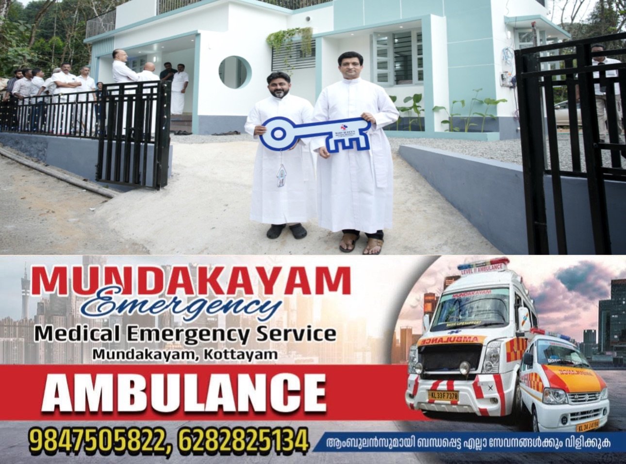 കാഞ്ഞിരപ്പളളി: പാറത്തോട് പഞ്ചായത്തിൽ മേരീക്വീൻസ് മിഷൻ ആശുപത്രി നടപ്പാക്കുന്ന ചാവറ ഭവന പദ്ധതി വഴി നിർമ്മിച്ചു നൽകുന്ന ഭവനത്തിന്റെ താക്കോൽ കൈമാറ്റം സി.എം.ഐ സഭ കോട്ടയം സെന്റ് ജോസഫ് പ്രവിശ്യാ വികർ പ്രൊവിൻഷ്യലും, സാമൂഹ്യ ക്ഷേമവിഭാഗം കൗൺസിലറും, മേരീക്വീൻസ് ഡയറക്ടറുമായ ഫാ. സന്തോഷ് മാത്തൻകുന്നേൽ സി.എം.ഐയും, വീടിന്റെ ആശീർവാദം മേരീക്വീൻസ് ആശുപത്രിയുടെ ഫിനാഷ്യൽ അഡ്മിനിസ്ട്രേറ്റർ ഫാ. മാർട്ടിൻ മണ്ണാനാൽ സി.എം.ഐയും നിർവ്വഹിച്ചു.