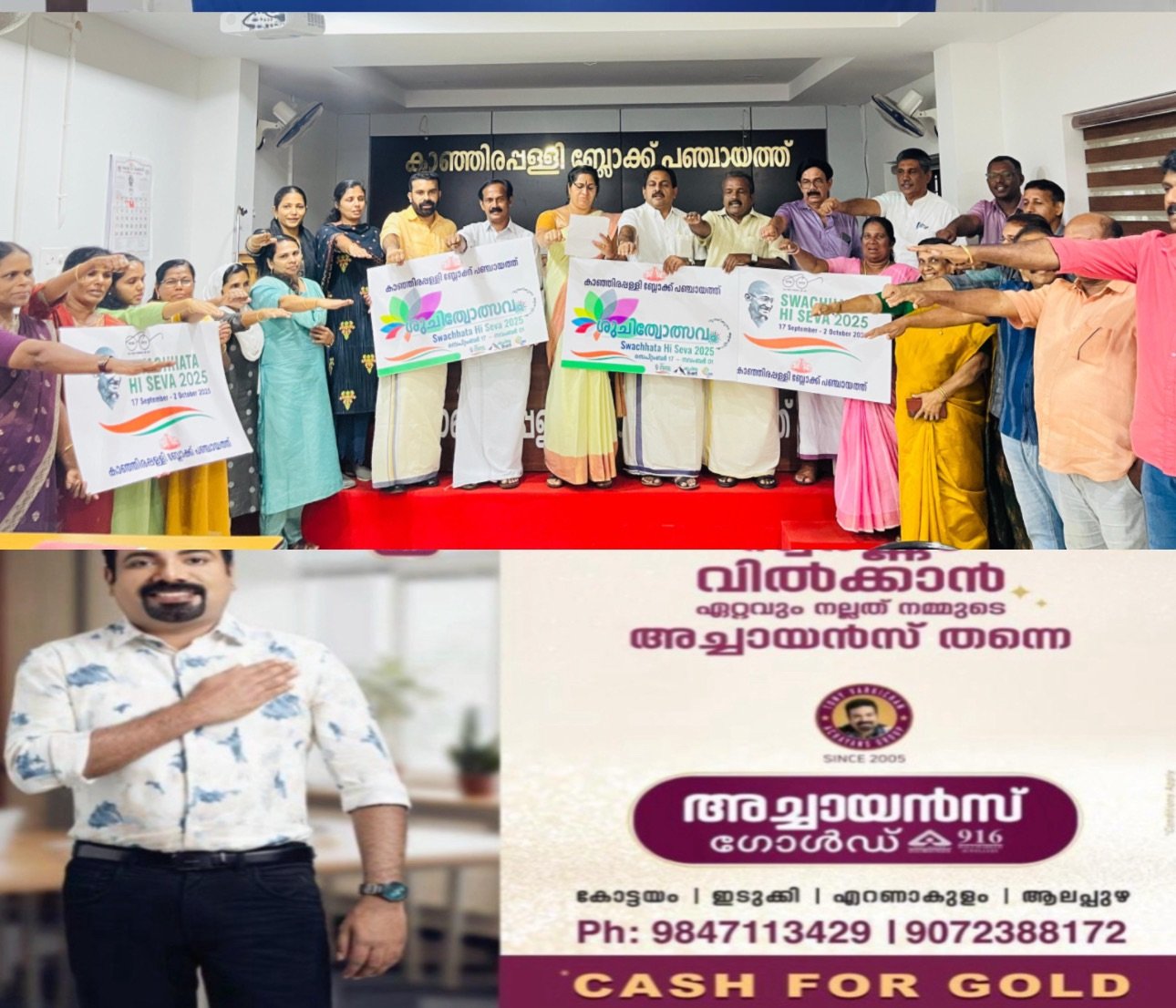 കാഞ്ഞിരപ്പളളി :-ദേശീയതലത്തിൽ മാലിന്യ നിർമ്മാർജ്ജന പ്രവർത്തനങ്ങളുടെ ഭാഗമായി സംഘടിപ്പിക്കുന്ന “സ്വച്ഛതാ കീ സേവ 2025” ക്യാമ്പയിൻ കാഞ്ഞിരപ്പളളി ബ്ലോക്ക് തല ഉദ്ഘാടനം പ്രസിഡൻറ് അജിത രതീഷ് നിർവ്വഹിച്ചു. ശുചീകരണ-ബോധവത്ക്കരണ പ്രവർത്തനങ്ങൾ സ്കൂൾതലത്തിൽ വിവിധ പരിപാടികൾ, കുടുംബശ്രീ, എൻ.എസ്.എസ്.. എൻ.സി.സി., സന്നദ്ധ സംഘടനകൾ, ക്യാമ്പയിൻറെ ഭാഗമാവും. ഹരിതകർമ്മ സേനാംഗങ്ങൾക്കായി പഞ്ചായത്ത് അടിസ്ഥാനത്തിൽ മെഡിക്കൽ ക്യാമ്പും, ഹെൽത്ത് കാർഡ് വിതരണവും നടത്തപ്പെടും. ഹയർ സെക്കണ്ടറി, ഹൈസ്കൂൾ വിദ്യാർത്ഥികൾക്കായി “വെയ്സ്റ്റ് ടു ആർട്ട്” മത്സരവും, എക്സിബിഷനും ക്യാമ്പയിൻറെ ഭാഗമായി സംഘടിപ്പിക്കും. ബ്ലോക്ക് പഞ്ചായത്ത് ഹാളിൽ നടന്ന ചടങ്ങിൽ ബ്ലോക്ക് പഞ്ചായത്ത് പ്രസിഡന്ർറ അജിത രതീഷ്,ബ്ലോക്ക് പഞ്ചായത്ത് വൈസ് പ്രസിഡൻറ് ശ്രീ. ജോളി മടുക്കക്കുഴി വിവിധ സ്റ്റാൻറിംഗ് കമ്മിറ്റി ചെയർപേഴ്സണ്ർമാരായ ഷക്കീലാ നസീര്ർ,ജയശ്രീ ഗോപിദാസ്, ഡിവിഷൻ അംഗങ്ങൾമാരായ റ്റി.എസ് ക്യഷ്ണകുമാര്ർ,പികെ പ്രദീപ്,ജോഷി മംഗലം,കെ.എസ് എമേഴ്സണ്ർ,രത്നമ്മ രവീന്ദ്രന്ജൂബി അഷറഫ്,അനു ഷിജു ബ്ലോക്ക് ഡെവലപ്മെൻറ് ഓഫീസർ സജീഷ് എസ്., ഉദ്യോഗസ്ഥർമാരായ അജേഷ് കുമാര്ർ,പ്രശാന്ത് സി,ഐ.ഒ ഫൈസല്ർ ശുചിത്വ മിഷൻ ആർ.പി. തുടങ്ങിയവർ പങ്കെടത്തു. ആരോഗ്യ സ്റ്റാൻറിംഗ് കമ്മിറ്റി ചെയർമാൻ ടി.ജെ. മോഹനൻ പ്രതിജ്ഞ ചൊല്ലി കൊടുത്തു.