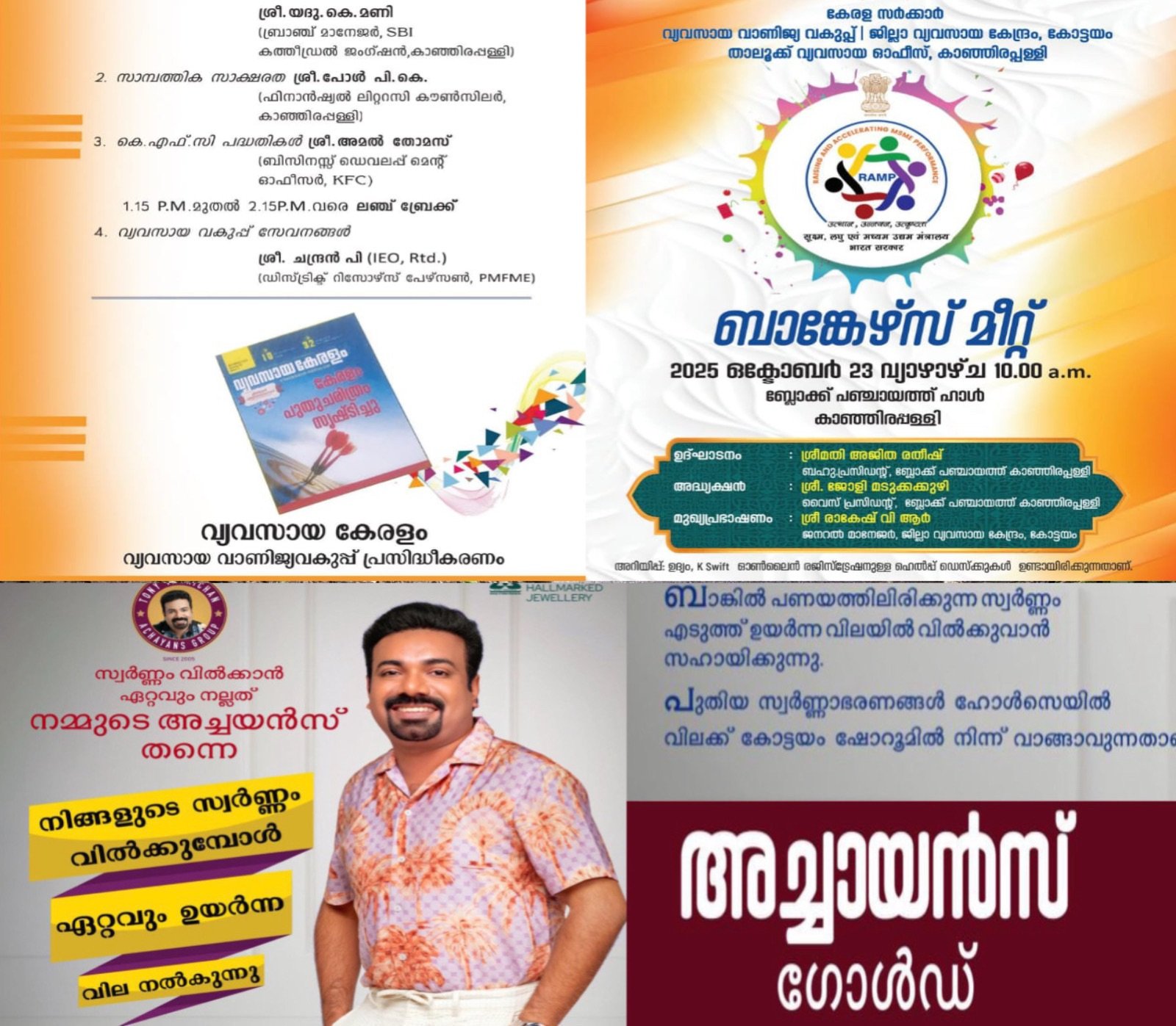 കാഞ്ഞിരപ്പളളി: ബ്ലോക്ക് പഞ്ചായത്തിന് കീഴില് സംരംഭം തുടങ്ങുവാന് ആഗ്രഹിക്കുന്നവര്ക്ക് ഇനി പണത്തിനായി നെട്ടോട്ടമോടേണ്ടതില്ല. കാഞ്ഞിരപ്പളളി ബ്ലോക്ക് പഞ്ചായത്തില് 23.10.2025 വ്യാഴം രാവിലെ 10 മണി മുതല് താലൂക്കിലെ വിവിധ ബാങ്കുകളുടെ സംഗമം സംഘടിപ്പിക്കുന്നു. പ്രൊജക്ടും, എസ്റ്റിമേറ്റുമായി എത്തുന്ന സംരംഭകര്ക്ക് വ്യവസായ വകുപ്പിന്റേയും, കാഞ്ഞിരപ്പളളി ബ്ലോക്ക് പഞ്ചായത്തിന്റേയും സഹായത്തോടെ വിവിധ ബാങ്കുകളില് നിന്നും ലോണും സര്ക്കാരിന്റെ മറ്റ് ആനുകൂല്യങ്ങളും സ്പോട്ടില് വെച്ച് തന്നെ നല്കപ്പെ ടുകയാണ് കാഞ്ഞിരപ്പളളി ബ്ലോക്ക് പഞ്ചായത്ത് വൈസ് പ്രസിഡന്റ് ജോളി മടുക്കകുഴി അദ്ധ്യക്ഷത വഹിക്കുന്ന ബാങ്കേഴ്സ് മീറ്റ് ബ്ലോക്ക് പഞ്ചായത്ത് പ്രസിഡന്റ് അജിത രതീഷ് ഉല്ഘാടനം ചെയ്യും. ജില്ലാ വ്യവസായ വകുപ്പ് മേധാവി രാകേഷ് വി.ആര്., ലീഡ് ബാങ്ക് ജില്ലാ മാനേജര് രാജു ഫിലിപ്പ്, പഞ്ചായത്ത് പ്രസിഡന്റ് കെ.ആര് തങ്കപ്പന്, ജില്ലാ പഞ്ചായത്ത് അംഗം ജെസ്സി ഷാജന്, ബിഡി.ഒ. സജീഷ് എസ്, താലൂക്ക് വ്യവസായവകുപ്പ് തലവന് കെ .കെ. ഫൈസല്, ലോറന്സ് മാത്യൂ, യദു കെ മണി, പി.കെ. പോള്, അമല് തോമസ്, ചന്ദ്രന് പി തുടങ്ങിയവര് വിവിധ പരിപാടികള്ക്ക് നേതൃത്വം നല്കും. പുതിയതും പഴയതുമായ സംരംഭകര്ക്ക് ഈ സുവര്ണ്ണാവസരം പ്രയോജനപ്പെടുത്താവുന്നതാണ്.