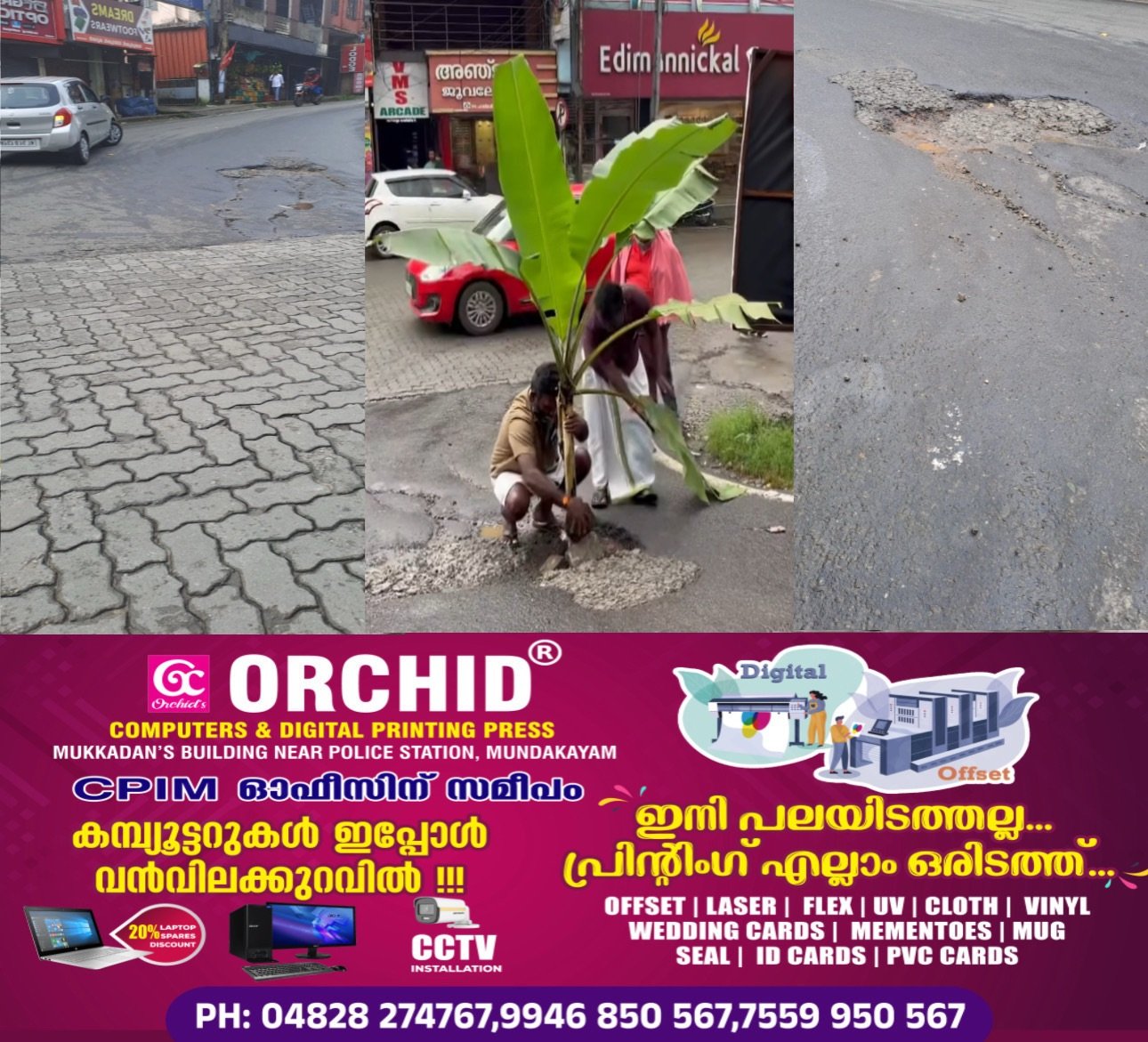 മുണ്ടക്കയം കൂട്ടിക്കൽ റോഡിലെ കുഴിയിൽ ഓട്ടോ തൊഴിലാളികൾ വാഴ നട്ട് പ്രതിഷേധിച്ചു എങ്കിലും ഇതുവരെ പരിഹാരം കാണാൻ സാധിച്ചിട്ടില്ല, റോഡിലെ കുഴിയിൽ വാഴ നട്ടു മടുത്തിട്ടും അധികൃതർ തിരിഞ്ഞു നോക്കുന്നില്ല എന്നും ഓട്ടോ തൊഴിലാളികൾ പറയുന്നു,