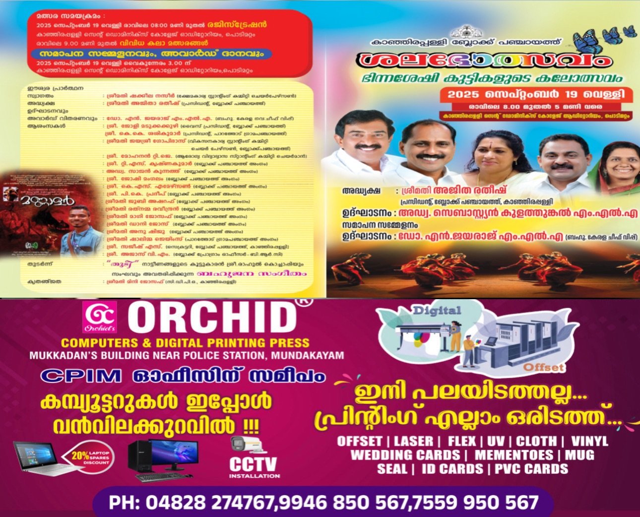 സമാപന സമ്മേളനം ബഹു.കേരള ചീഫ് വിപ്പ് ഡോ.എന്.ജയരാജ് എം.എല്.എ ഉച്ചക്കഴിഞ്ഞ് 3.30ന് ഉദ്ഘാടനം ചെയ്യുന്നതുമാണ്.കാഞ്ഞിരപ്പളളി ബ്ലോക്ക് പഞ്ചായത്ത് പരിധിയിലുളള ഏഴ് ഗ്രാമപഞ്ചായത്തുകളില് നിന്നുളള മത്സരാര്ത്ഥികള് മാറ്റുരയ്കകുന്ന ഈ മഹനീയ വേദിയില് കലോത്സവത്തില് വര്ണശലഭം പോല് കുരുന്നുകള് പാറികളിക്കുന്നത് കാണുവാനും കലാവിരുന്ന് ആസ്വദിക്കുവാനും പ്രോത്സാപ്പിക്കുന്നതിനും ഏവരേയും സ്വാഗതം ചെയ്യുന്നു.