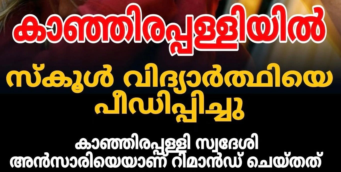 ഒൻപതാം ക്ലാസ്സ് വിദ്യാർത്ഥിനിയോട് ലൈംഗികാതിക്രമം നടത്തിയ സംഭവത്തിൽ സ്വകാര്യ സ്കൂൾ പിടിഎ പ്രസിഡന്റ് അറസ്റ്റിലായി. ഇടക്കുന്നം മുക്കാലി സ്വദേശി അൻസാരിയെയാണ് കാഞ്ഞിരപ്പള്ളി പോലീസ് അറസ്റ്റ് ചെയ്തത്. കോടതിയിൽ ഹാജരാക്കിയ പ്രതിയെ റിമാൻഡ് ചെയ്തു.