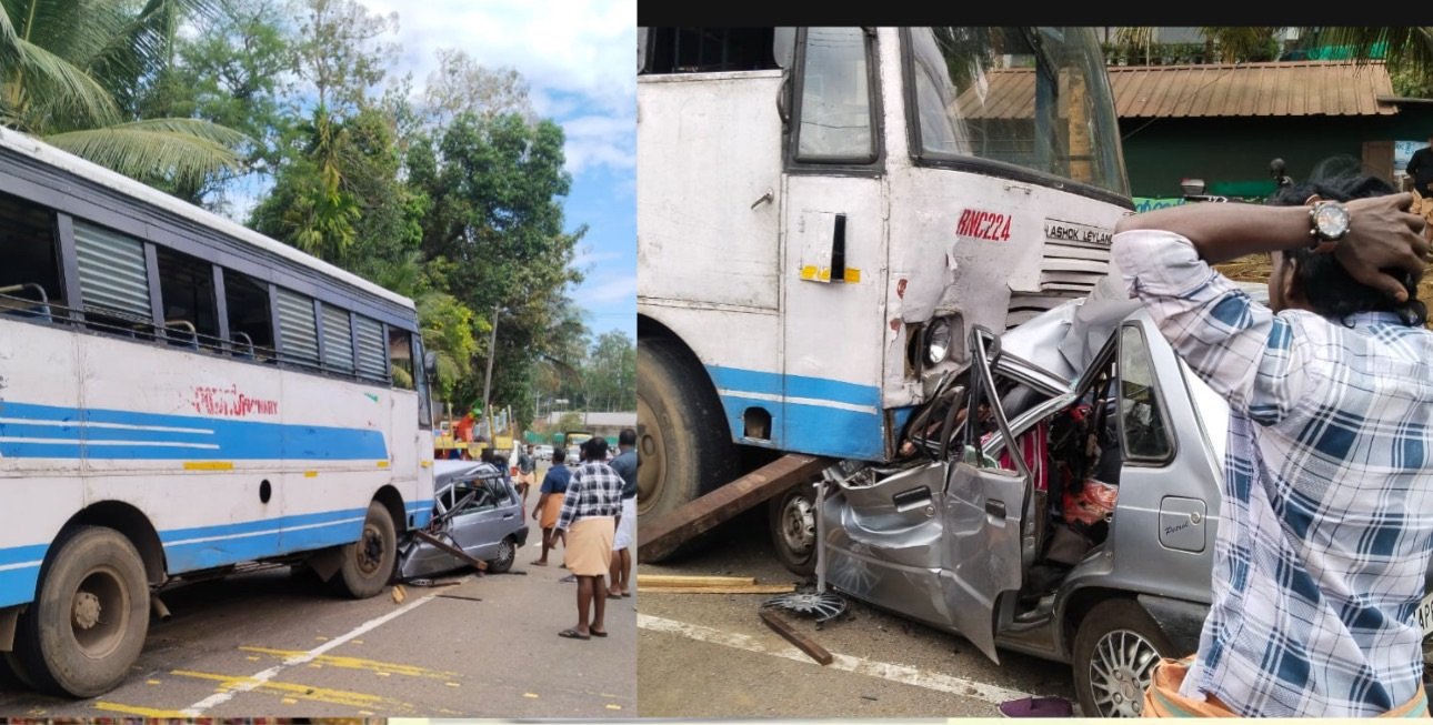 തിങ്കളാഴ്ച രാവിലെ 11 മണിയോടെയായിരുന്നു അപകടം. നിയന്ത്രണം നഷ്ടപ്പെട്ട കാർ കെഎസ്ആർടിസി ബസ്സിലേക്ക് ഇടിച്ചു കയറുകയായിരുന്നുവെന്ന് ദൃക്സാക്ഷികൾ പറയുന്നു. തിരുവൈരാണിക്കുളം ക്ഷേത്രദർശനം കഴിഞ്ഞ് മടങ്ങുകയായിരുന്നു കാർ യാത്രികർ എന്നാണ് പ്രാഥമിക വിവരം.