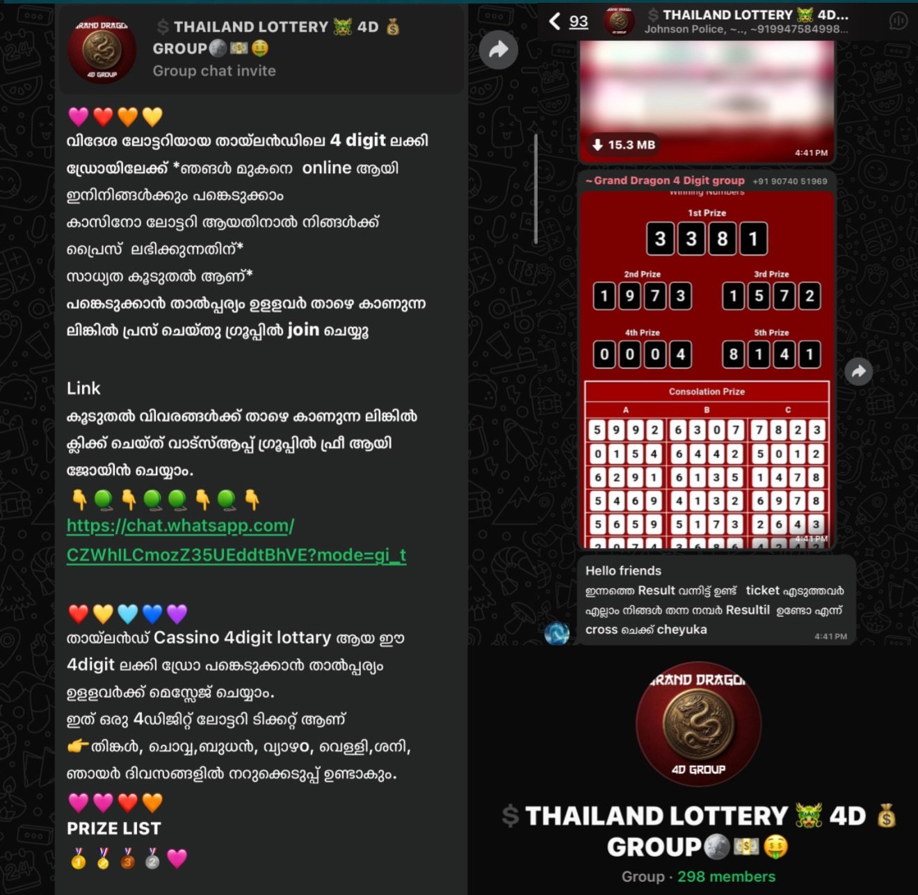 മുണ്ടക്കയം: മൊബൈൽ നെറ്റ്വർക്ക് ഉപഭോക്താക്കളെ കേന്ദ്രീകരിച്ച് മുണ്ടക്കയത്ത് വ്യാപകമായ ഓൺലൈൻ ലോട്ടറി തട്ടിപ്പ് നടക്കുന്നു. ‘Grand Dragon 4 Digit Group’ എന്ന പേരിൽ പ്രവർത്തിക്കുന്ന വാട്സ്ആപ്പ് ഗ്രൂപ്പിലൂടെയാണ് നിയമവിരുദ്ധമായി നാലക്ക ലോട്ടറി വിൽപന നടക്കുന്നത്. മുന്നൂറോളം അംഗങ്ങളുള്ള ഈ ഗ്രൂപ്പിലൂടെ പ്രതിദിനം ലക്ഷക്കണക്കിന് രൂപയുടെ ഇടപാടുകൾ നടക്കുന്നതായാണ് വിവരം. മുണ്ടക്കയം കേന്ദ്രമായി പ്രവർത്തിക്കുന്ന ഒരു ഓൺലൈൻ ചാനിലിൽ ആണ് ഇത്തരം തട്ടിപ്പ് സംഘങ്ങളുടെ വാട്സാപ്പ് ഗ്രൂപ്പ് ലിങ്ക് ഷെയർ ചെയ്യുന്നത്,