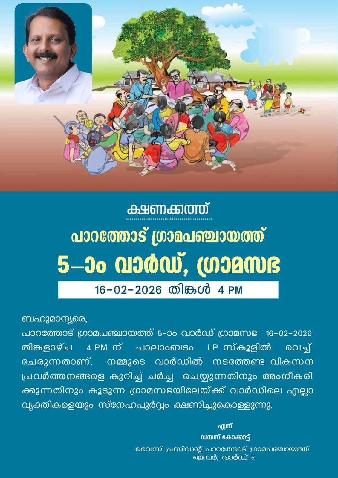 പാറത്തോട്:പാറത്തോട് ഗ്രാമപഞ്ചായത്ത് അഞ്ചാം വാർഡ് ഗ്രാമസഭ 16 /02/2026 തിങ്കളാഴ്ച 4 പി എമ്മിന് പാലാമ്പടം എൽ പി സ്കൂളിൽ വച്ച് ചേരുന്നതാണ് വാർഡിലെ വികസന പ്രവർത്തനങ്ങളെ കുറിച്ച് ചർച്ചചെയ്യുന്നതിനായി നടത്തപ്പെടുന്ന ഈ ഗ്രാമസഭയിൽ എല്ലാ അംഗങ്ങളും പങ്കെടുക്കണമെന്ന് പാറത്തോട് ഗ്രാമപഞ്ചായത്ത് വൈസ് പ്രസിഡണ്ടും വാർഡ് മെമ്പറുമായ ഡയസ് മാത്യു കോക്കാട്ട് അറിയിച്ചു