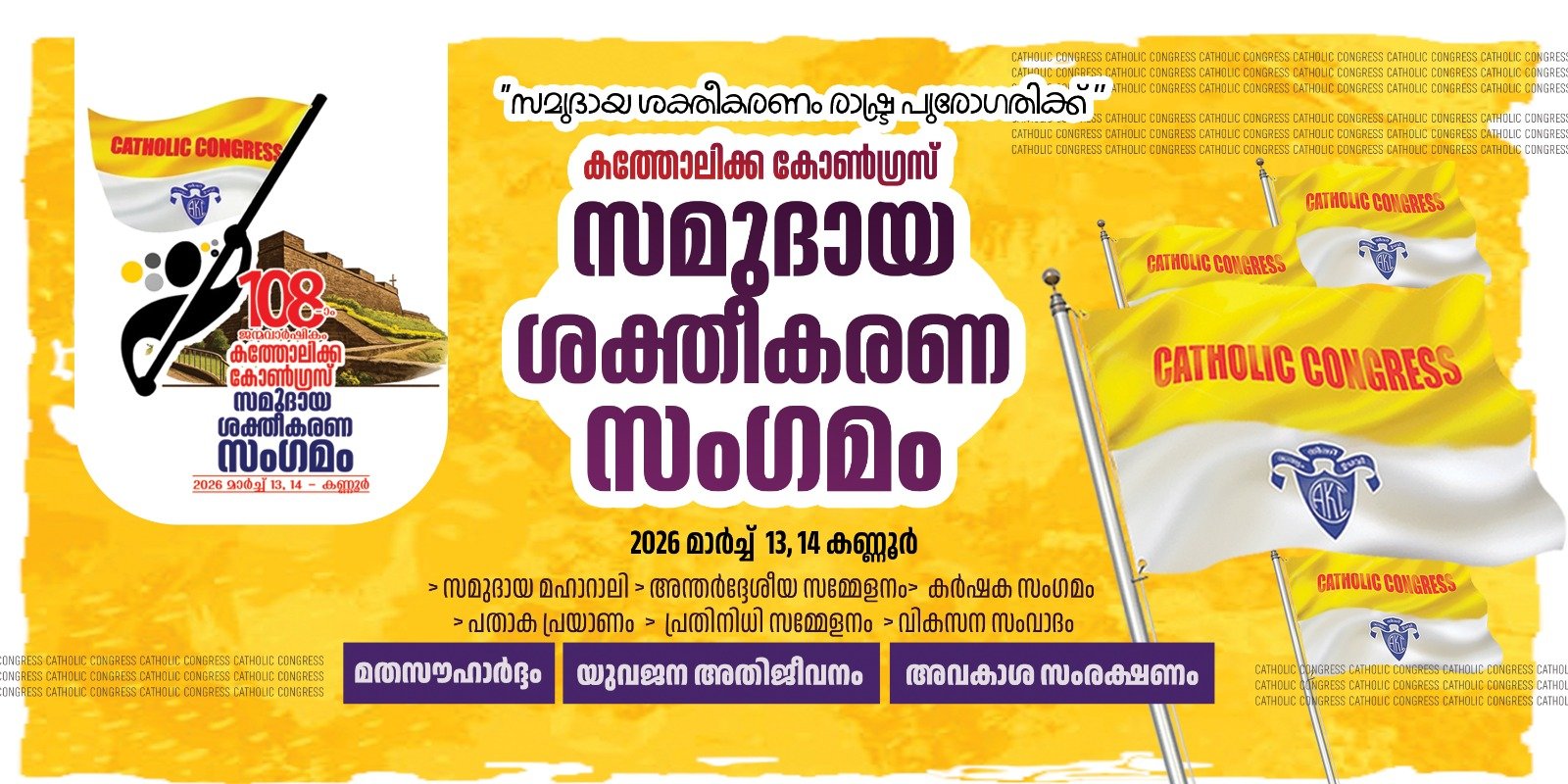 കണ്ണൂരിൽ നടക്കുന്ന കത്തോലിക്ക കോൺഗ്രസ് ജന്മവാർഷിക യോഗത്തിലും അന്തർദ്ദേശിയ സമ്മേളനത്തിലും വിവിധ രാജ്യങ്ങളിൽ നിന്നുള്ള പ്രതിനിധികൾ പങ്കെടുക്കും. മാർച്ച് 14 ന് കണ്ണൂർ പോലീസ് പരേഡ് ഗ്രൗണ്ടിൽ വച്ച് നടക്കുന്ന സമുദായ ശക്തീകരണ സംഗമത്തിൽ രാഷ്ട്രീയ നിലപാട് പ്രഖ്യാപിക്കുമെന്നും കത്തോലിക്ക കോൺഗ്രസ് കേന്ദ്ര സമതി അറിയിച്ചു.
