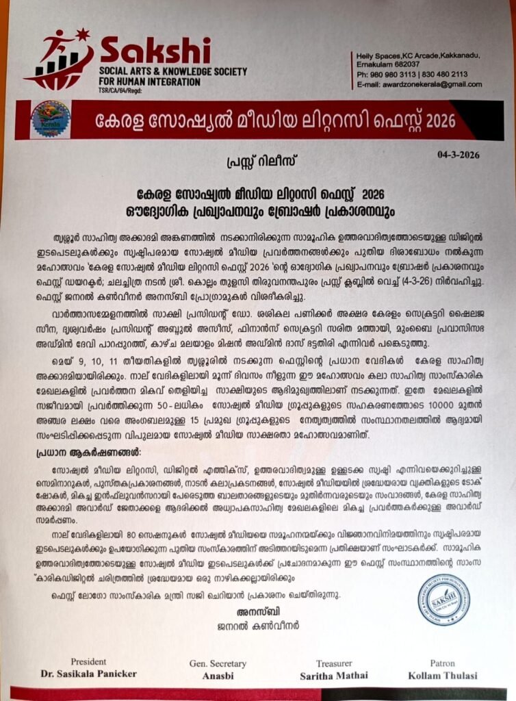 തിരുവനന്തപുരം:തൃശ്ശൂർ സാഹിത്യ അക്കാദമി അങ്കണത്തിൽ നടക്കാനിരിക്കുന്ന സാമൂഹിക ഉത്തരവാദിത്വത്തോടെയുള്ള ഡിജിറ്റൽ ഇടപെടലുകൾക്കും സൃഷ്ടിപരമായ സോഷ്യൽ മീഡിയ പ്രവർത്തനങ്ങൾക്കും പുതിയ ദിശാബോധം നൽകുന്ന മഹോത്സവം ‘കേരള സോഷ്യൽ മീഡിയ ലിറ്ററസി ഫെസ്റ്റ് 2026 ‘ൻ്റെ ഓദ്യോഗിക പ്രഖ്യാപനവും ബ്രോഷർ പ്രകാശനവും ഫെസ്റ്റ് ഡയറക്ടർ; ചലച്ചിത്ര നടൻ ശ്രീ. കൊല്ലം തുളസി തിരുവനന്തപുരം പ്രസ്സ് ക്ലബ്ലിൽ വെച്ച് (4-3-26) നിർവഹിച്ചു.