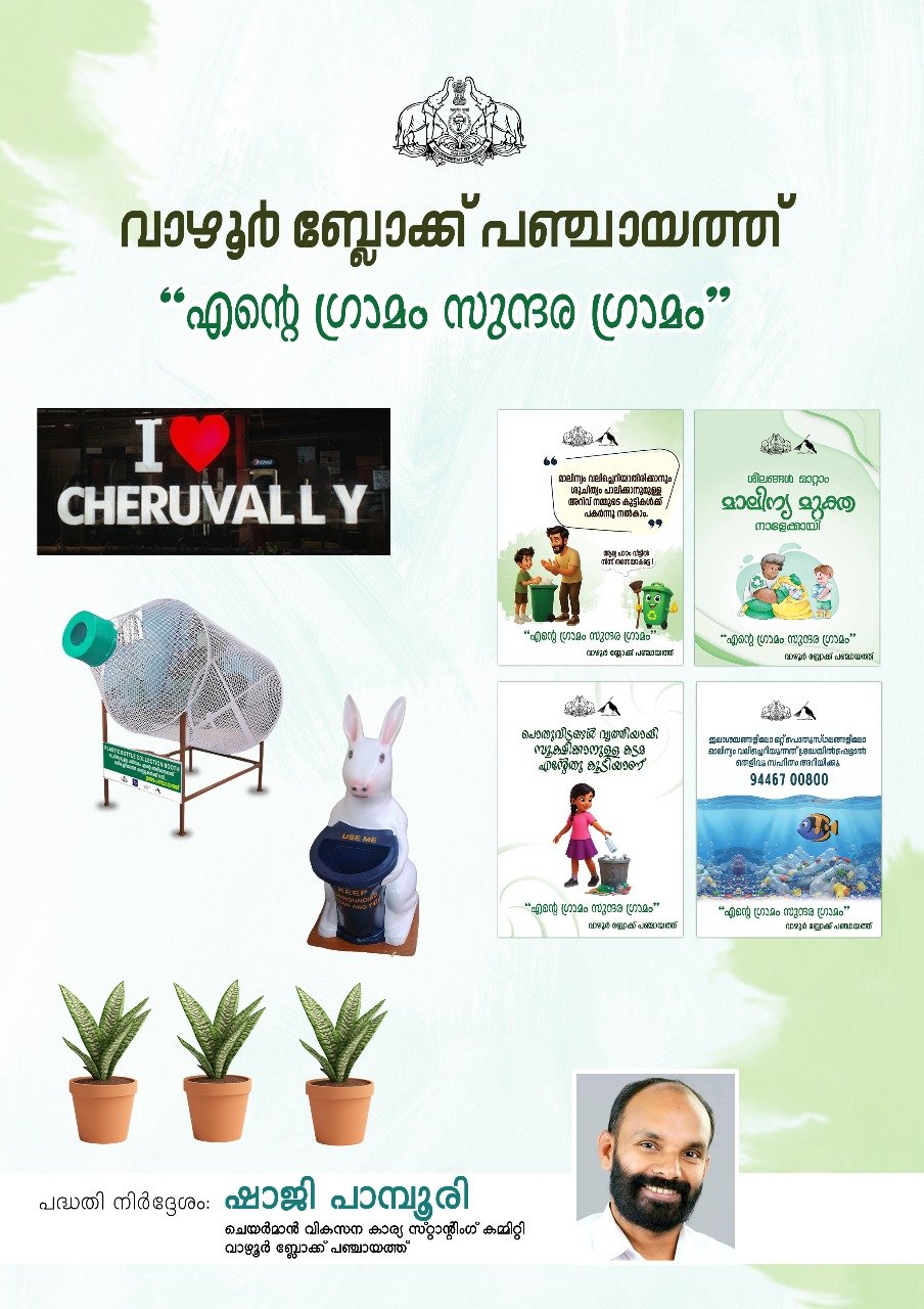 എൻ്റെ ഗ്രാമം – സുന്ദര ഗ്രാമം എന്ന പേരിൽ വാഴൂർ ബ്ലോക്ക് പഞ്ചായത്ത് ഒരു പുതിയ പദ്ധതിക്ക് തുടക്കം കുറിക്കുകയാണ്. സ്ഥലനാമ ബോർഡ്, ശുചിത്വ സന്ദേശ ബോർഡുകൾ, ബോട്ടിൽ ബൂത്ത് (പ്ലാസ്റ്റിക് കുപ്പികൾ നിക്ഷേപിക്കുന്നതിന്), വേസ്റ്റ് ബിൻ (Rabit Model) , ചെടികൾ, ക്യാമറ എന്നിവ ഈ പദ്ധതിയുടെ ഭാഗമായി സ്ഥാപിക്കുവാനാണ് ഉദ്ദേശിക്കുന്നത്.