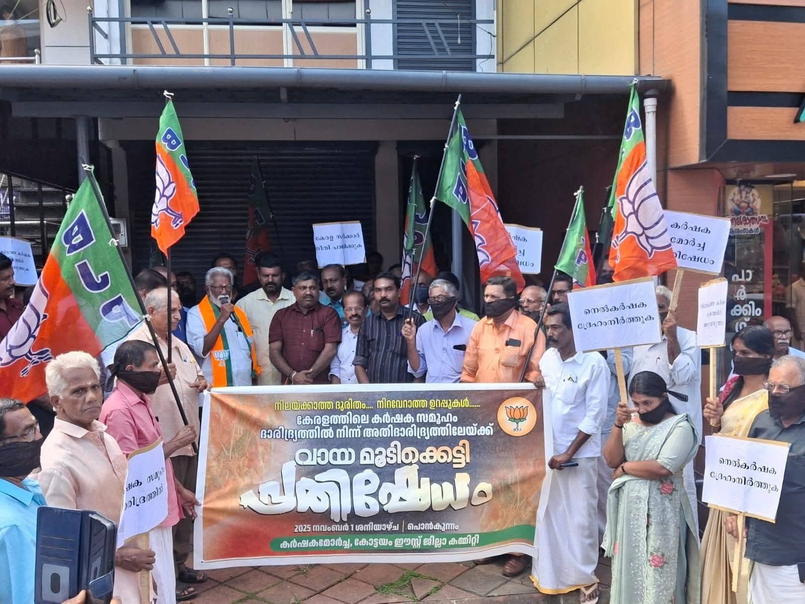 അന്ന ദാതാക്കളായ കർഷകർ കണ്ണീരും കയ്യുമായി കഴിയുമ്പോൾ കേരളത്തിൽ ദാരിദ്രമില്ലെന്ന് പ്രഖ്യാപിച്ച് മേനി നടിക്കുന്ന മുഖ്യമന്ത്രി ജനങ്ങളെ കബളിപ്പിക്കുകയാണെന്ന് ബി.ജെ. പി ദേശീയ നിർവാഹ സമിതിയംഗം ശ്രീ.കുമ്മനം രാജശേഖരൻ . കോട്ടയം ഈസ്റ്റ് ജില്ലാ കർഷക മോർച്ചയുടെ നേതൃത്വത്തിൽ പൊൻകുന്നത്ത് നടന്ന വായ്മൂടിക്കെട്ടി സമരം ഉദ്ഘാടനം ചെയ്തു സംസാരിച്ചു. കർഷക മോർച്ച ജില്ലാ അദ്ധ്യക്ഷൻ രതീഷ് ചെങ്കിലാത്ത് അദ്ധ്യക്ഷനായ യോഗത്തിൽ ബി.ജെ.പി കോട്ടയം ഈസ്റ്റ് ജില്ലാ പ്രസിഡൻ്റ് റോയി ചാക്കോ ,ജന സെക്രട്ടറി വി.സി അജികുമാർ, സെക്രട്ടറിമാരായ ടി. ബി. ബിനു ,ജി.ഹരിലാൽ , കർഷക മോർച്ച ജില്ലാ ജനറൽ സെക്രട്ടറി സന്തോഷ് കൊട്ടാരം ,സെക്രട്ടറി എ.സി റജികുമാർ എന്നിവർ സംസാരിച്ചു