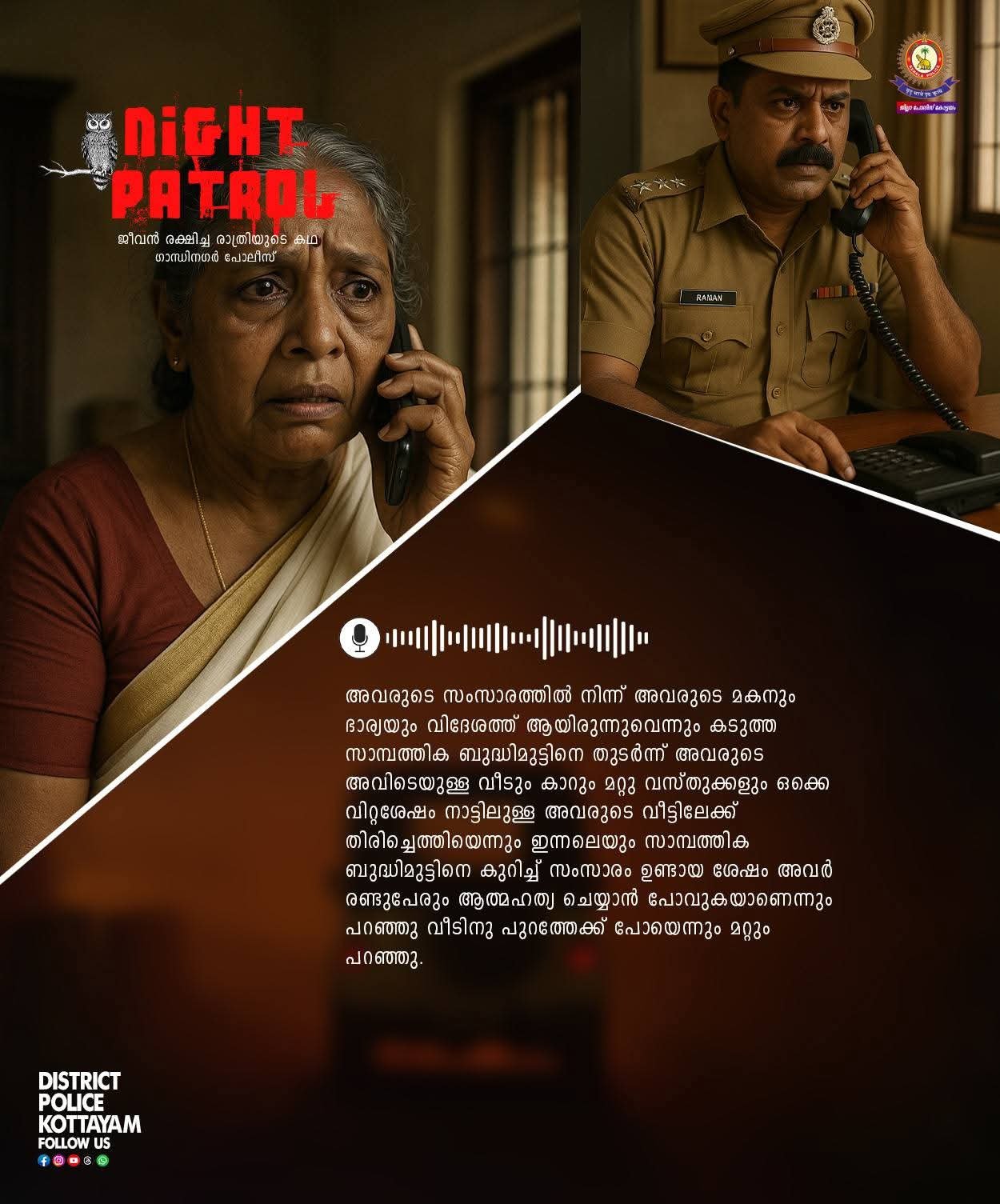 കോട്ടയം:04.11.25 രാത്രി ഏകദേശം 9 30 മണിയോടെ കോട്ടയം ഗാന്ധിനഗർ സ്റ്റേഷൻ ഫോണിലേക്ക് ഒരു കാൾ വരുന്നു സംസാരിച്ചപ്പോൾ മറുതലക്കൽ അല്പം പ്രായമായ ഒരു സ്ത്രീ വളരെ പരിഭ്രമത്തോടുകൂടിയും പേടിയോടു കൂടിയും അവ്യക്തമായി എന്തൊക്കെയോ കാര്യങ്ങൾ പറയുന്നുണ്ടായിരുന്നു. അവരുടെ സംസാരത്തിൽ നിന്ന് അവരുടെ മകനും ഭാര്യയും വിദേശത്ത് ആയിരുന്നുവെന്നും കടുത്ത സാമ്പത്തിക ബുദ്ധിമുട്ടിനെ തുടർന്ന് അവരുടെ അവിടെയുള്ള വീടും കാറും മറ്റു വസ്തുക്കളും ഒക്കെ വിറ്റശേഷം നാട്ടിലുള്ള അവരുടെ വീട്ടിലേക്ക് തിരിച്ചെത്തിയെന്നും ഇന്നലെയും സാമ്പത്തിക ബുദ്ധിമുട്ടിനെ കുറിച്ച് സംസാരം ഉണ്ടായ ശേഷം അവർ രണ്ടുപേരും ആത്മഹത്യ ചെയ്യാൻ പോവുകയാണെന്നും പറഞ്ഞു വീടിനു പുറത്തേക്ക് പോയെന്നും മറ്റും പറഞ്ഞു. GD ചാർജ് പ്രതീഷ് രാജ് ഫോൺ നമ്പറും മറ്റു വിവരങ്ങളും കുറിച്ചെടുത്ത ശേഷം ഉടൻതന്നെ നൈറ്റ് ഓഫീസർ ഡ്യൂട്ടിയിൽ ഉണ്ടായിരുന്ന SI സിബിമോനെയും CPO ഡെന്നിയെയും വിവരമറിയിച്ചു. ഭക്ഷണം കഴിച്ചു കൊണ്ടിരുന്ന ഇരുവരും സംഭവത്തിന്റെ ഗൗരവം മനസ്സിലാക്കി ഉടൻതന്നെ ഭക്ഷണം കഴിക്കുന്നത് മതിയാക്കി പെട്ടെന്ന് തന്നെ സ്റ്റേഷൻ മൊബൈലിൽ സംഭവസ്ഥലത്തേക്ക് ചെന്നു. ഫോൺ വിളിച്ച സ്ത്രീയെ തിരിച്ചു വിളിക്കുകയും ആ പരിസരത്തെല്ലാം അന്വേഷണം നടത്തു കയും ചെയ്തതിൽ അവരുടെ മകനെയും ഭാര്യയും നീലിമംഗലം റെയിൽവേ ട്രാക്കിനടുത്ത് നിൽക്കുന്നതായി കണ്ടു സംസാരത്തിൽ നിന്നും പെരുമാറ്റത്തിൽ നിന്നും അവർ ജീവനൊടുക്കാൻ വന്നിരിക്കുകയാണ് എന്ന് മനസ്സിലായി അവരെ ആത്മഹത്യയിൽ നിന്ന് പിന്തിരിപ്പിച്ച് അവർക്ക് പറയാനുള്ളതെല്ലാം സാവധാനം ക്ഷമയോടെ കേൾക്കുകയും അവർക്ക് ധൈര്യവും ആശ്വാസവും പകർന്ന് അവരെ തിരികെ വീട്ടിൽ കൊണ്ട് ആക്കിയതിനും ശേഷമാണ് ഇരുവരും തിരികെ പോന്നത്. അവർ സംഭവസ്ഥലത്ത് എത്തുന്നതിന് അല്പം വൈകിയിരുന്നെങ്കിൽ പിറ്റേന്ന് നാടുണരുന്നത് ഒരു വലിയ ദുരന്തവാർത്ത കേട്ടുകൊണ്ടായിരുന്നേനേ. പോലീസ് കൃത്യസമയത്ത് സന്ദർഭോചിതമായി ഇടപെട്ടതിനെ തുടർന്ന് ഒരു വലിയ ദുരന്തം ഒഴിവാകുകയും രണ്ടു ജീവനുകൾ രക്ഷിക്കാനും സാധിച്ചു.