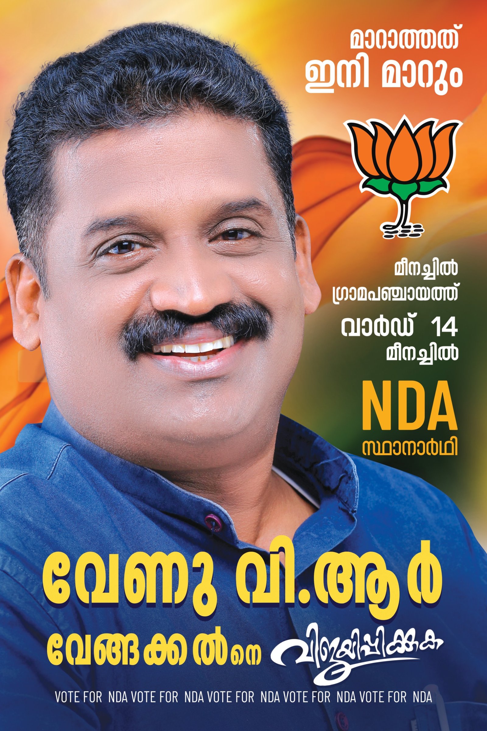 പാലാ :മീനച്ചിൽ ഗ്രാമപഞ്ചായത്ത് പതിനാലാം വാർഡ് മീനച്ചിലിൽ ഇടതു വലതുമുന്നണി സ്ഥാനാർത്ഥികൾക്ക് ശക്തമായ വെല്ലുവിളി ഉയർത്തി എൻഡിഎ സ്ഥാനാർത്ഥി വേണു വി ആർ വേങ്ങക്കൽ, ശക്തമായ ത്രികോണം മത്സരം നടക്കുന്ന ഇവിടെ പൊതുപ്രവർത്തനരംഗത്ത് വർഷങ്ങളുടെ പരിചയസമ്പത്തുള്ള വേണു വൻവിജയം നേടുമെന്നാണ് എംഡിഎ വൃത്തങ്ങൾ പറയുന്നത്
