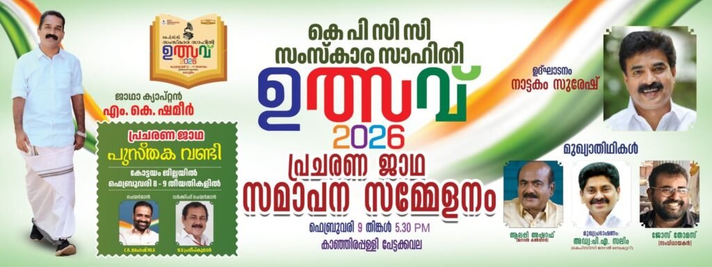 കാഞ്ഞിരപ്പള്ളി : കെ പി സി സി സംസ്കാര സഹിതി   സംസ്ഥാന കമ്മിറ്റിയുടെ ആഭിമുഖ്യത്തിൽ 2026 ഫെബ്രുവരി 12 മുതൽ   17 വരെ കോട്ടയത്തു വെച്ചു നടത്തപ്പെടുന്ന   “ഉത്സവ് 2026 ”   പരിപാടിയുടെ പ്രചരനാർത്ഥം  സംസ്കാര സാഹിതി  സ്വാഗത സംഘം കമ്മിറ്റിയുടെ നേതൃത്വത്തിൽ  പുസ്തക വണ്ടി  ഫെബ്രുവരി 9 – 10 തീയതികളിൽ കോട്ടയം ജില്ലയിലെ എല്ലാ നിയോജക മണ്ഡലങ്ങളിൽ  പര്യടനം നടത്തി