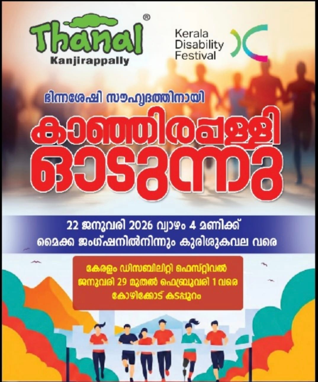കാഞ്ഞിരപ്പള്ളി : ഭിന്നശേഷിക്കാരുടെ അവകാശങ്ങൾ സംരക്ഷിക്കാനും അവർക്ക് തുല്യനീതി ഉറപ്പാക്കുന്ന വിവേചനരഹിതമായ ഒരു സമൂഹം കെട്ടിപ്പടുക്കാനുമായി പൊതുസമൂഹത്തെ പ്രാപ്തരാക്കുക എന്ന ലക്ഷ്യത്തോടെ 2026 ജനുവരി 29,30,31, ഫെബ്രുവരി 1 തീയതികളിൽ കോഴിക്കോട് ബീച്ചിൽ കേരള ഡിസെബിലിറ്റി ഫെസ്റ്റിവൽ സംഘടിപ്പിക്കുകയാണ്. കോഴിക്കോട് ജില്ലാ ഭരണകൂടത്തിന്റെ നേതൃത്വത്തിൽ തണലിൻ്റെയും വിവിധ സന്നദ്ധ സംഘടനകളുടെയും പൗരാവലിയുടെയും സഹകരണത്തോടെ സംഘടിപ്പിക്കുന്ന ഈ ഡിസെബിലിറ്റി ഫെസ്റ്റിവലിൻ്റെ സന്ദേശം കാഞ്ഞിരപ്പള്ളിയിലെ പൊതുസമൂഹത്തിലേക്ക് എത്തിക്കുക എന്ന ലക്ഷ്യത്തോടെ വിപുലമായ തരത്തിൽ ഒരു വിളംബര കൂട്ടയോട്ടം സംഘടിപ്പിക്കുകയാണ്.