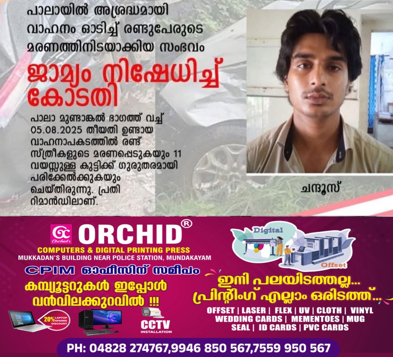 പാലാ: ഇക്കഴിഞ്ഞ 05- ആം തീയ്യതി രാവിലെ 09.00 മണിക്ക് പാലാ മുണ്ടാങ്കൽ ഭാഗത്ത് വച്ച് ഉണ്ടായ വാഹന അപകടത്തിൽ ധന്യ, ജോമോൾ എന്നീ രണ്ട് സ്ത്രീകൾ മരണപ്പെടുകയും ജോമോളുടെ മകൾ പാലാ സെന്റ് മേരീസ് സ്കൂളിലെ ആറാം ക്ലാസ് വിദ്യാർത്ഥിനി അന്നമോൾ ഗുരുതരാവസ്ഥയിലാകുന്നതിനും ഇടയായ സംഭവത്തിൽ നെടുങ്കണ്ടം ചെറുവിള വീട്ടിൽ ചന്ദൂസിൻ്റെ(24) ജാമ്യാപേക്ഷ തള്ളി കോടതി.പാലാ പോലീസ് മനപ്പൂർവമല്ലാത്ത നരഹത്യക്ക് കേസെടുത്ത് റിമാന്റിലായിരുന്ന, അപകടമുണ്ടാക്കിയ വാഹനം ഓടിച്ചിരുന്നത് ഇയാളായിരുന്നു. റിമാൻഡിലായിരുന്ന ഇയാൾഅധ്യാപക വിദ്യാർത്ഥിയായിരുന്നു. ജാമ്യാപേക്ഷയിൽ വാദം കേട്ട പാലാ ജുഡീഷ്യൽ ഒന്നാം ക്ലാസ്സ് മജിസ്ട്രേട്ട് കോടതിയാണ് ഇന്നലെ (07.08.2025)ജാമ്യാപേക്ഷ തള്ളിയത്.