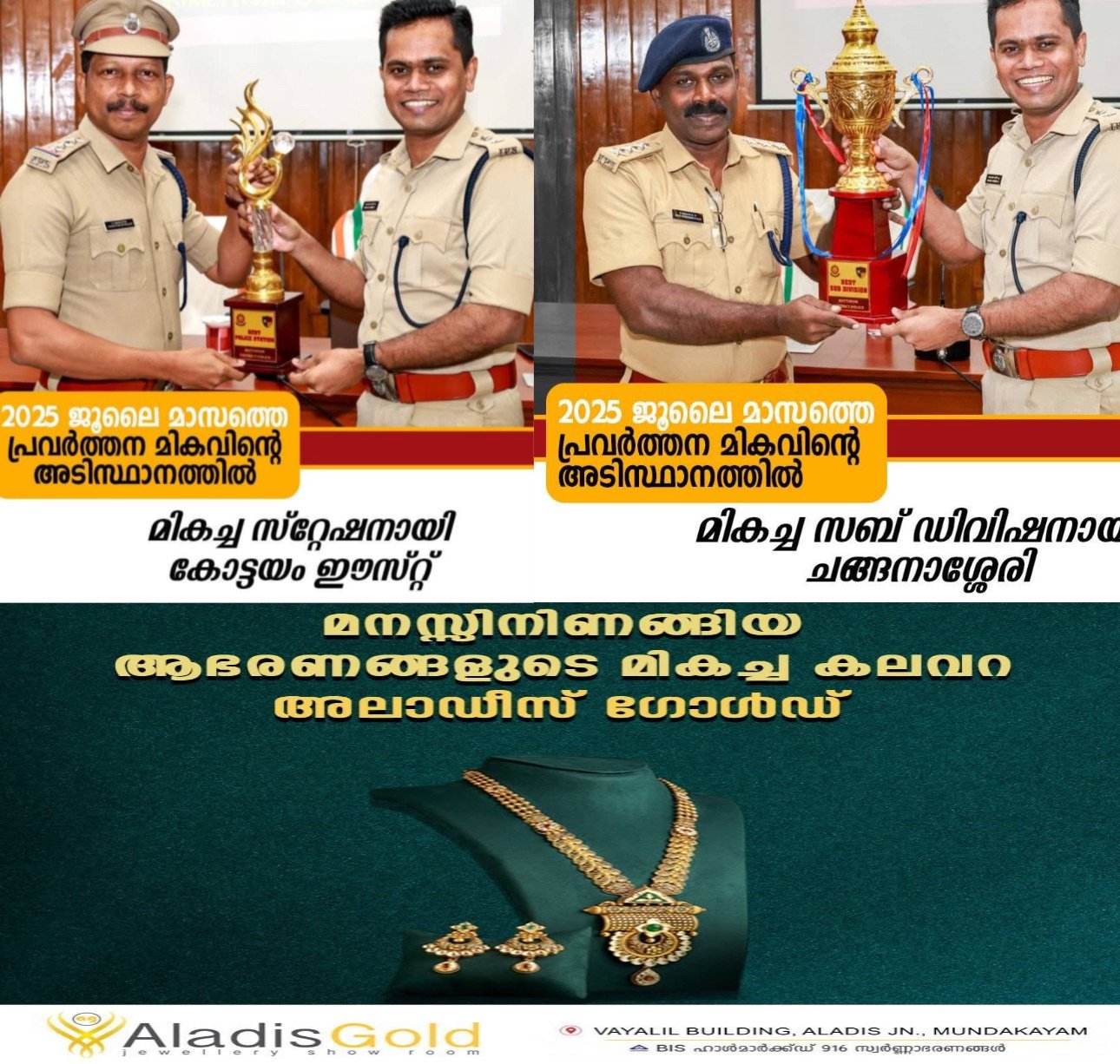 ജില്ലയിലെ ജൂലൈ മാസത്തെ പ്രവർത്തന മികവിന്റെ അടിസ്ഥാനത്തിൽ മികച്ച സ്റ്റേഷനായി കോട്ടയം ഈസ്റ്റ് സ്റ്റേഷനേയും, മികച്ച സബ്ഡിവിഷനായി ചങ്ങനാശ്ശേരി സബ്ഡിവിഷനേയും തിരഞ്ഞെടുത്തു. 13.08.2025 തീയതി കോട്ടയം പോലീസ് ക്ളബിൽ വച്ച് നടന്ന ക്രൈം കോൺഫറൻസിൽ മികച്ച സബ് ഡിവിഷനായി തെരഞ്ഞെടുക്കപ്പെട്ട ചങ്ങനാശ്ശേരിയെ പ്രതിനിധീകരിച്ച് ഡി.വൈ.എസ്.പി തോംസൺ കെ പി , കോട്ടയം ഈസ്റ്റ് സ്റ്റേഷൻ എസ്.എച്ച്.ഓ U. ശ്രീജിത്ത് എന്നിവര് പുരസ്കാരം ഏറ്റുവാങ്ങി.