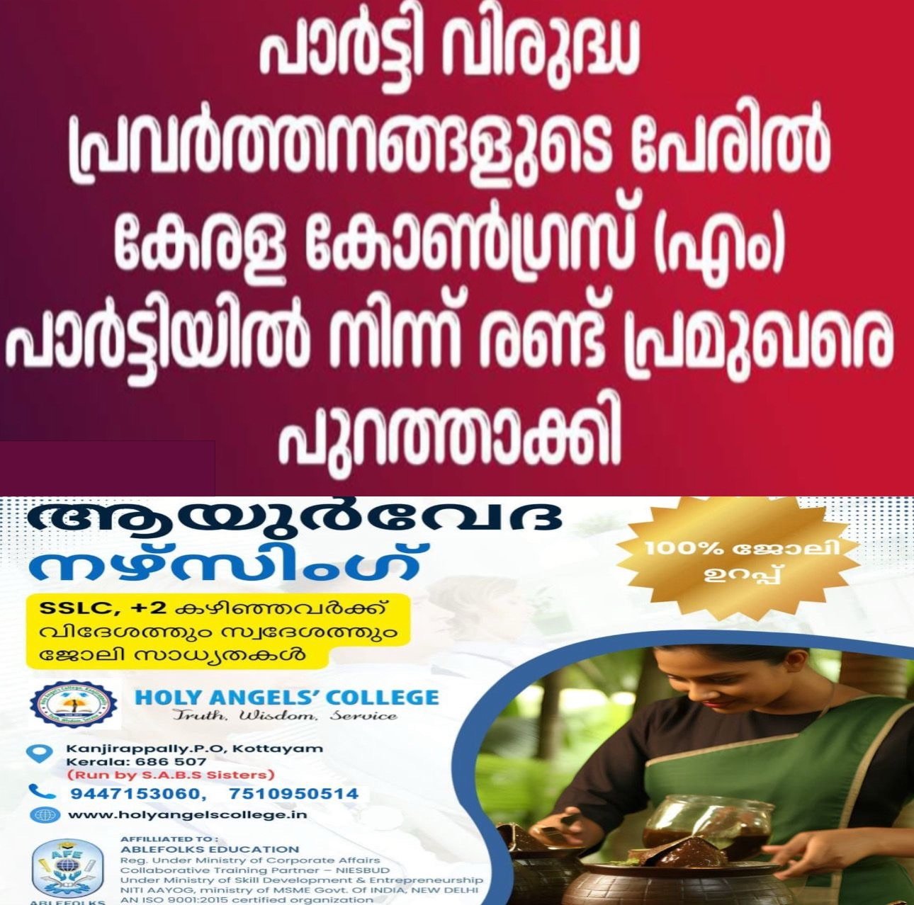കാഞ്ഞിരപ്പള്ളി : ത്രിതല പഞ്ചായത്തു തെരഞ്ഞെടുപ്പ് കാലഘട്ടങ്ങളിലെ പാർട്ടി വിരുദ്ധ പ്രവർത്തനങ്ങളുടെ പേരിൽ സണ്ണിക്കുട്ടി അഴകമ്പ്രയിൽ, സിറിൾ തോമസ് തടത്തിപറമ്പിൽ എന്നിവരെ കേരള കോൺഗ്രസ് (എം)പാർട്ടിയിൽ നിന്ന് പുറത്താക്കിയതായി പാർട്ടി മണിമല മണ്ഡലം പ്രസിഡന്റ് ബാബു തോമസ് വാർത്താകുറിപ്പിൽ അറിയിച്ചു.