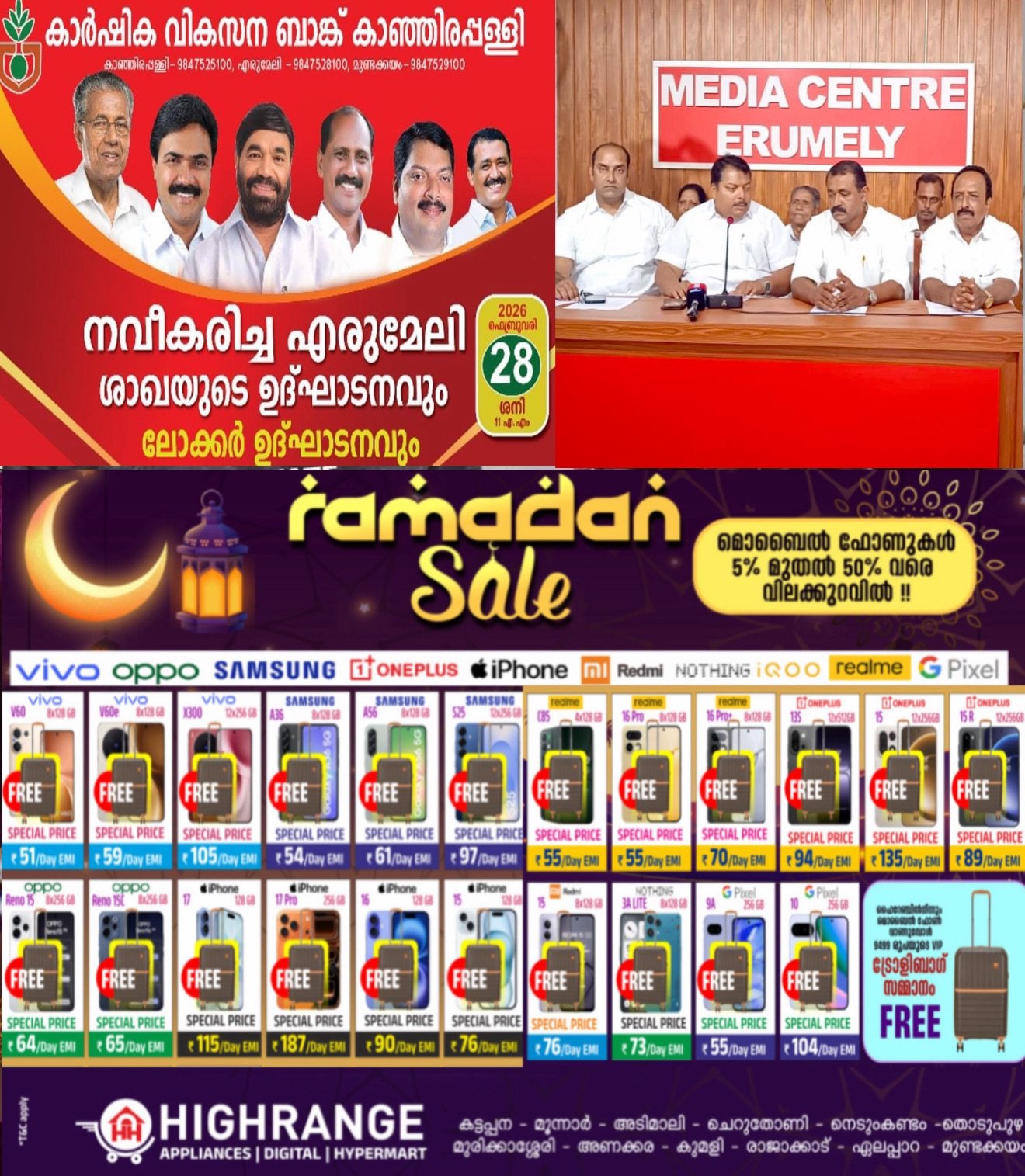കാഞ്ഞിരപ്പള്ളി കാർഷിക വികസന ബാങ്കിന്റെ നവീകരിച്ച എരുമേലി ശാഖയുടെ ഉദ്ഘാടനവും ലോക്കർ ഉദ്ഘാടനവും,മികച്ച കർഷകരെ ആദരിക്കലും 2026 ഫെബ്രുവരി 28-)0 തിയതി ശനിയാഴ്ച രാവിലെ 11 മണിക്ക് എരുമേലി (പ്രൈവറ്റ് ബസ് സ്റ്റാൻഡിന് എതിർവശം ) വച്ച് നടത്തപെടുകയാണ്. നവീകരിച്ച എരുമേലി ശാഖയുടെ ഉദഘാടനവും ലോക്കർ ഉദഘാടനവും,മികച്ച കർഷകരെ ആദരിക്കലും ബഹു.അഡ്വ: സെബാസ്റ്റ്യൻ കുളത്തുങ്കൽ എം.എൽ.എ നിർവഹിക്കും. വിവിധ ബാങ്ക് പ്രസിഡന്റ്മാർ, മത-രാഷ്ട്രീയ-സാമൂഹിക നേതാക്കൾ തുടങ്ങിയവർ ആശംസകൾ അർപ്പിച്ച് സംസാരിക്കുന്നതാണ്. അന്നേദിവസം ബാങ്കിൽ സ്വർണ്ണ പണയ വായ്പ്പയും, പ്രതിമാസ സമ്പാദ്യ പദ്ധതിയും ആരംഭിക്കുന്നതാണ്.
