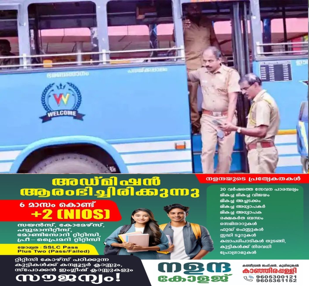 കോട്ടയം കാഞ്ഞിരപ്പള്ളിയിലാണ് സംഭവം. ഒമ്ബത് ബസുകളാണ് വാതില് തുറന്നിട്ട് സർവിസ് നടത്തിയതായി കണ്ടെത്തിയത്. ബസില് നിറയെ ആളുകളുമുണ്ടായിരുന്നു. ആര്.ടി.ഒ എന്ഫോഴ്സ്മെന്റ് സ്ക്വാഡും ജോ. ആര്.ടി.ഒ ഉദ്യോഗസ്ഥരുമാണ് പരിശോധന നടത്തിയത്.